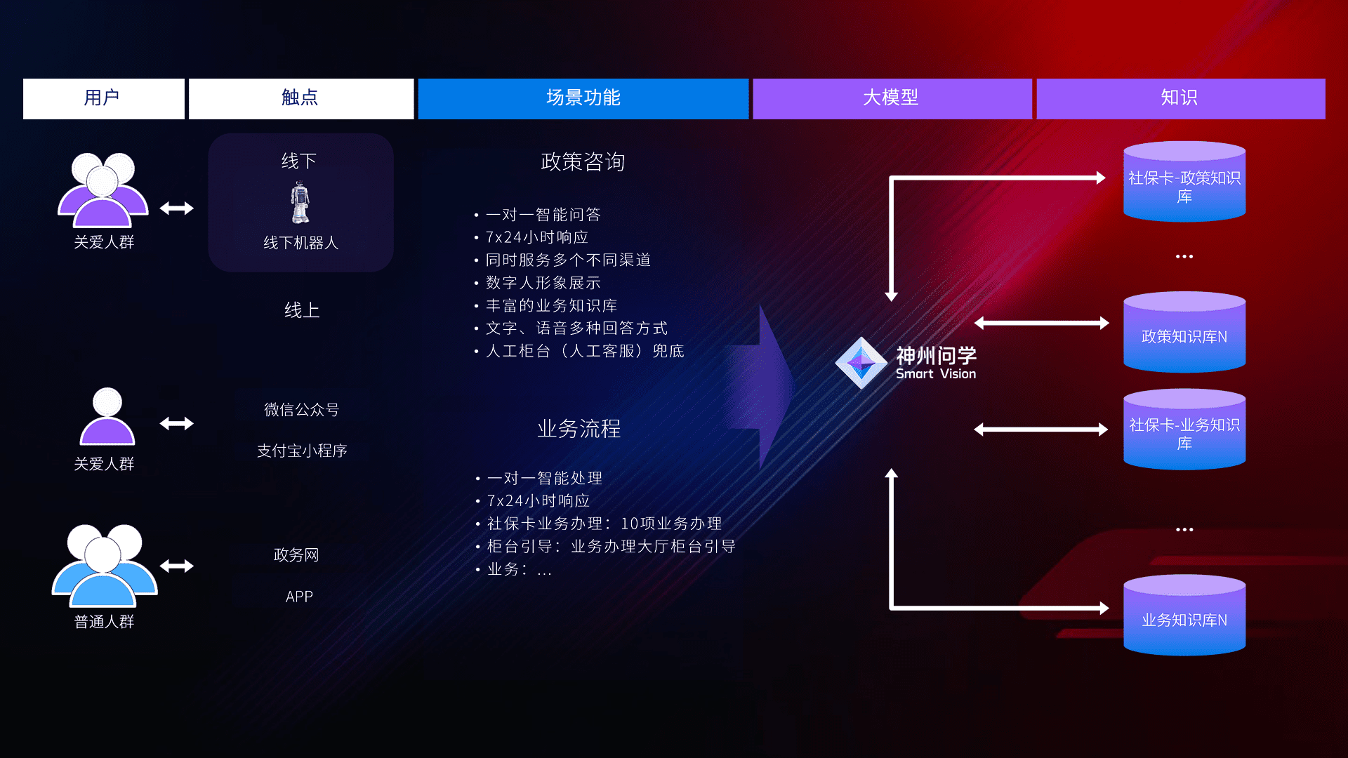 • 线上线下全覆盖:线上提供微信公众号、、、、支付宝小程序、、、、政务网、、、app多种渠道,,,与线下机器人形成完整服务体系。。。
